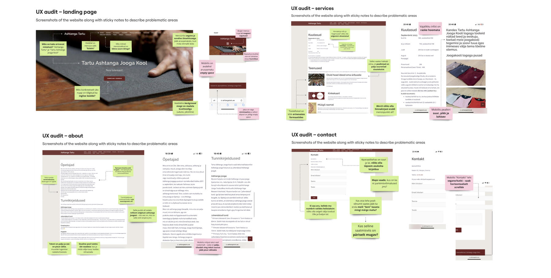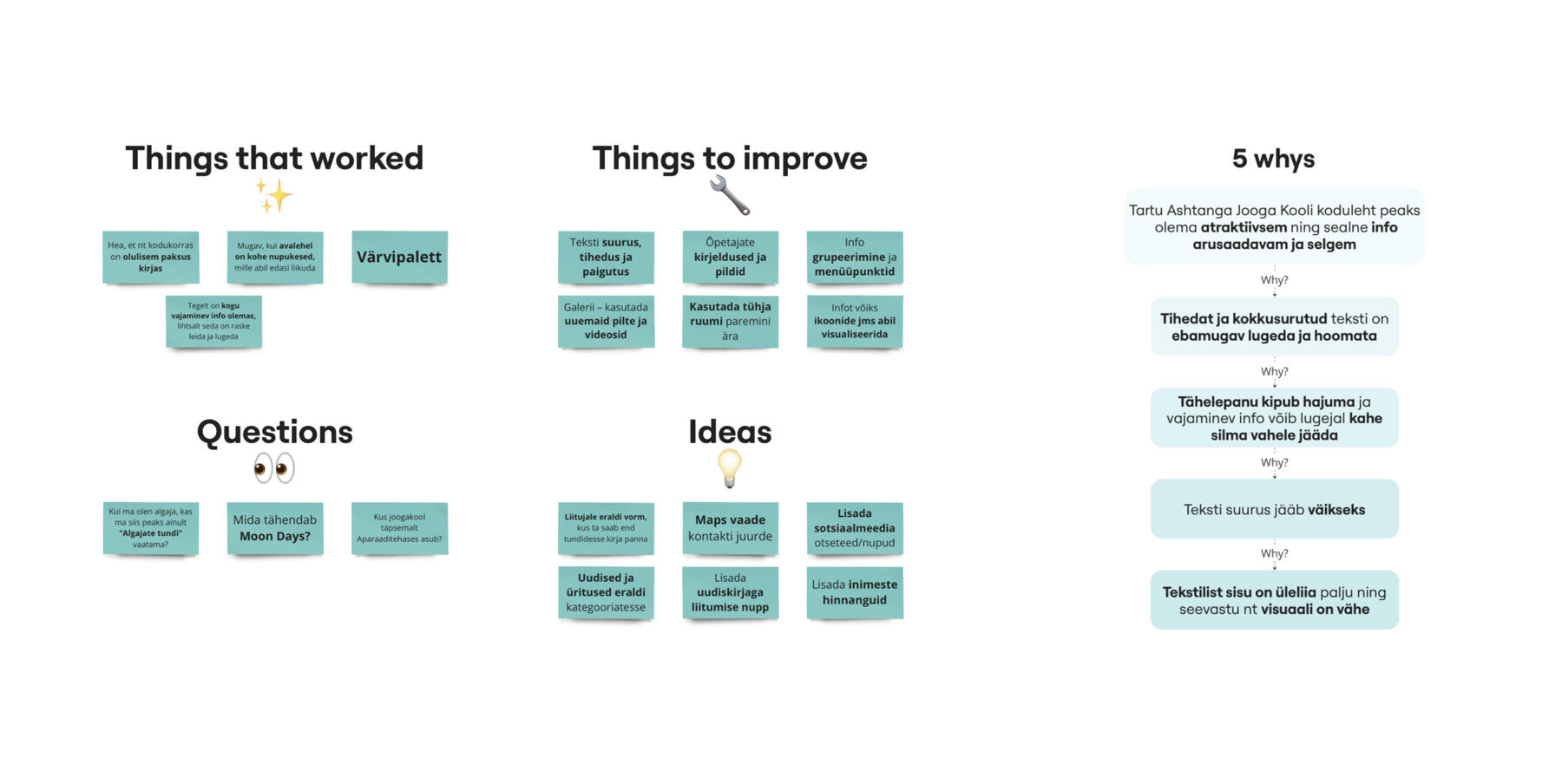 Following that, I delved into desk research, exploring websites of competitors, such as other yoga studios and sports clubs in Tartu.Next, I transitioned to the user research phase, developing a Typeform survey modeled after the previous website to gain insights on user preferences and needs.Simultaneously, I conducted usability tests with four participants, comprising both current and potential students, to identify real-time website usage errors. These tests were designed to mirror the previous website's structure.Based on the gathered information, I moved on to the problem definition phase by doing exercises such as the '5 Whys' and HMW questioning.