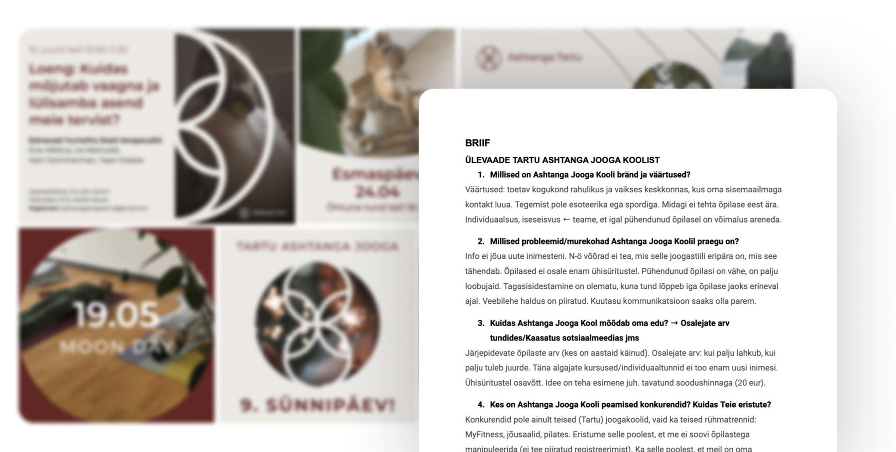 I kicked off the process by crafting a client brief.The aim was to grasp where the company stands now and to understand its mission, values, and identity. In this phase, I gathered crucial details and discovered that one thing was non-negotiable: sticking to the graphic design style already established by Tartu Ashtanga Yoga School.